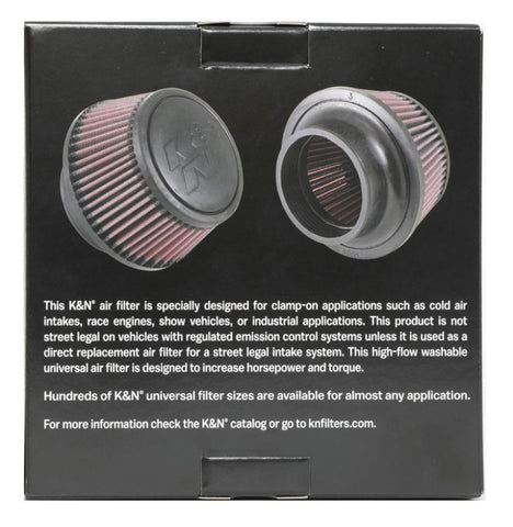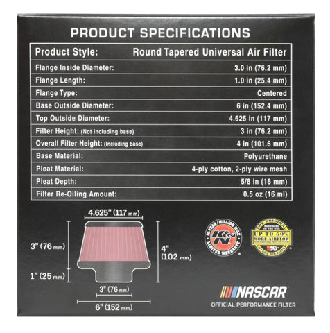 K&N Universal Round Clamp-On Air Filter 3in Flange ID x 6in Base OD x 4.625in Top OD x 3in Height