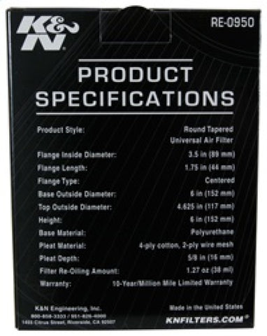 K&N Universal Rubber Filter 3 1/2inch ID FLG / 6inch Base / 4-5/8inch Top / 6inch Height
