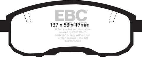 EBC Yellowstuff is an aramid fibre based brake compound with high brake effect form cold and is possibly one of the first ever compounds that can be used for STREET AND TRACK DRIVING. These pads do not require warm up but do get even stronger under the heat of hard driving. These are not a low dust pad and if your desire is for a low dust premium street use pad, you should consider EBC Redstuff.When considering full race use, Yellowstuff has been a strong favourite, having been used for two years in the Swedish Camaro Cup and at numerous other race events where a stock caliper system is fitted.It is also the choice of 90-percent of the Mazda MX5 Miata competitors in the UK race series and has an unblemished record as rotor friendly track pad for vehicles up to 2000 lbs weight or 200 BHP.In the USA the SCCA and NASA drivershave been testing Yellowstuff with feedback and good reports POURING in from a 543 test driver major market proving event with these groups. Read that figure again 543 test drivers.There is no guesswork here.