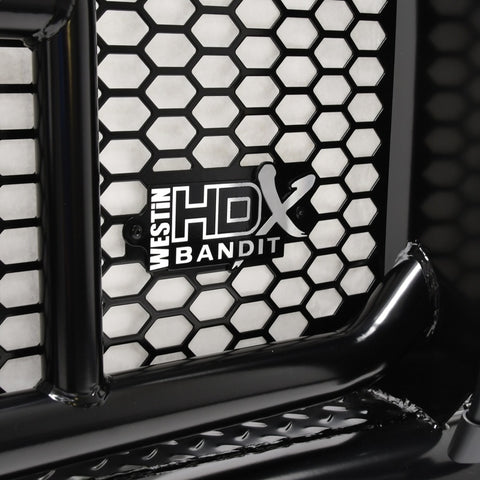 Westins HDX Bandit Bumper combines a heavy duty diamond plate steel bumper constructed of schedule 40 steel pipe with a stylish grille guard featuring 2" diameter outer wraparound wings and 2 3/4" wide upright rubber strips. Designed to protect headlights, grille, hood and front fenders from road hazards, debris and wildlife damage. Features a stylish metal honeycomb mesh screen, which allows maximum airflow to the intercooler or radiator area while accenting the front end styling with a clean and rugged look. Removable mesh screens allow for factory camera and adaptive cruise control options available on some late model Ford applications. HDX Bandit Bumper includes a built-in 2" receiver hitch and (2) heavy duty 9,500 lbs bow shackle mounts, capable of delivering multiple towing options. Compatible for factory fog lamps or LED post mount lights. In addition, some late model Ram and Chevrolet applications feature provisions for factory parking sensors. Bolt-on installation with hardware and mounting brackets included. Available in black powder coat finish.