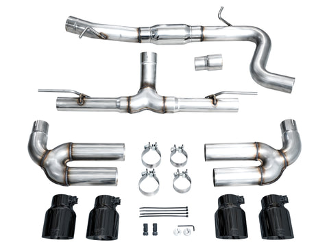 The Track Edition features a 3” inlet complete with an adapter to accommodate the factory downpipe perfectly while leaving an open 3” connection. Featuring minimal filter with one bullet resonator in the center, the Track Edition provides a full-bodied soundtrack at all times.. This configuration provides the best ratio of interior refinement and exterior rumble on the market. No valves needed. Switch driving modes and the exhaust will render the same result as a vavled exhaust. It's the do-it-all exhaust for every day drivers. Comes complete with quad 4.5" slash-cut, double-walled tips in diamond black. The AWE Track Edition for the 8Y S3 is made in the USA and backed by AWE’s Fitment Guarantee, 50 state emissions compliance, No Check Engine Light Guarantee, and the AWE Lifetime Warranty.
