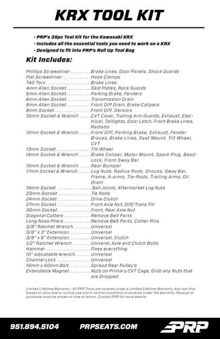 PRP's Kawasaki KRX Roll-Up Tool Kit provides everything you need to fix your Kawasaki Teryx KRX or KRX4 out on the trail. This 35 piece kit includes a selection of high-quality ratchets, sockets, wrenches, extension bars, pliers, and a ball peen hammer (for when things get really fun). We've hand picked the exact tools that are needed most when working on a KRX - So you have only the essentials that you really need, without adding the extra weight of an entire tool box. Below we have listed all the tools included, along with a handy guide to the most common uses for each tool. Each tool also includes a Limited Lifetime Warranty. The Roll-Up Bag makes it easy to keep everything neat and organized. It features dedicated sleeves for all the tools included in the kit, as well as a zippered pocket to hold the sockets and any other tools you want to bring with you. The bag is made from extremely durable twill material. It features heavy duty buckles, and an easy to carry grab handle. It can be mounted, or stored securely inside the vehicle. The roll-up style bag makes it quick and easy to grab out of the vehicle when you need it, and the tools inside don't make noise when bouncing around the trails. Don't get caught out on the trail unprepared. PRP's Roll-Up Tool Kit has everything you need to get your Kawasaki Teryx KRX going! Fitment: Kawasaki Teryx KRX & Kawasaki Teryx KRX4 KIT INCLUDES: ALLEN Sockets 4mmx3/8 - Skid plate, rock guards 5mmx3/8 - Parking brake, fenders 6mmx3/8 - Transmission drain 8mmx3/8 - Front diff drain, brake caliper TORX BITS- Sockets T40x3/8 - Brake lines SOCKETS/WRENCHES 8mmx3/8 - Front diff, sensors 10mmx3/8 - CVT cover, trailing-arm guards, exhaust, electrical grounds, taillights, door latch, front brake lines, radiator 10mm End Wrench 12mmx3/8 - Front diff, parking brake, exhaust, fender braces, brake lines, seat mount, tilt wheel, CVT 12mm End Wrench 13mmx3/8 - Tilt wheel 14mmx3/8 - Brake caliper, motor mount, spark plug, bead lock