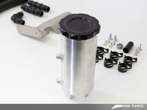 Designed in-house at AWE, our ColdFront™ product line is the solution for consistent and reliable performance for modified vehicles looking for maximum power and security. AWE ® ColdFront™ products include: The AWE ® ColdFront™ Reservoir - part of the ColdFront family - is CNC Machined from 6061 Billet Aluminum and plumbed directly into the heat exchanger coolant system to increase supercharger coolant capacity. The increase in coolant capacity leads to lower coolant temperatures, in turn supporting lower air intake temperatures. To further reduce coolant temperatures, the AWE ® ColdFront™ Reservoir incorporates a true flow through design which acts to reduce coolant temperature as it flows through the unit. The AWE ® ColdFront™ Reservoir features an anodized aluminum cap laser etched with the AWE logo, ensuring that checking the coolant level is a breeze. The AWE ® ColdFront™ Reservoir can be used either in combination with other members of the AWE ® ColdFront™ product line or can be used with the factory heat exchanger.