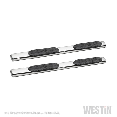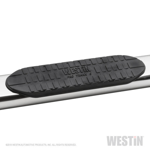 6 Pro Traxx Oval Tube Step Bars by Westin?. With Rocker Panel Mount. Add style and functionality to your truck with these easily installed oval tube step bars. The powder coated black or polished 304 stainless steel finish and angled ends with fully welded caps will enhance the appearance of any truck while the textured logo step pads give you sure footing to ease cab access. The included mount kit includes everything required for installation including zinc plated stainless steel hardware and detailed instructions.