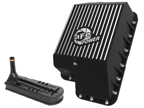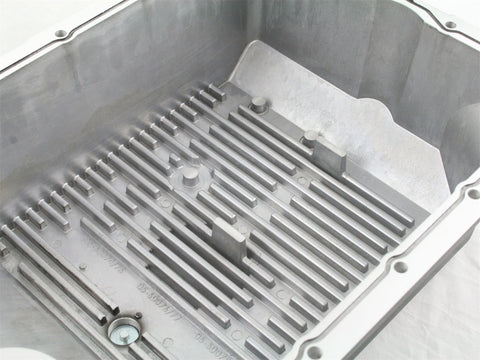 aFe POWER Pro Series deep transmission pan brings performance engineering to the protection of your trucks transmission. This transmission pan has additional capacity for 7-1/2 more quarts over stock at the factory line, a magnetic drain plug and a 1/8" NPT port for your temperature sensor. Built-in internal and external fins transfer heat from the fluid to the outside air for maximum cooling. This transmission pan is constructed out of durable die-cast A380 aluminum with reinforced ribs and a wrinkle black powder-coating for maximum strength and styling.