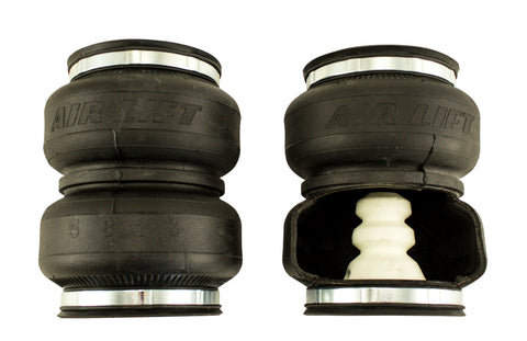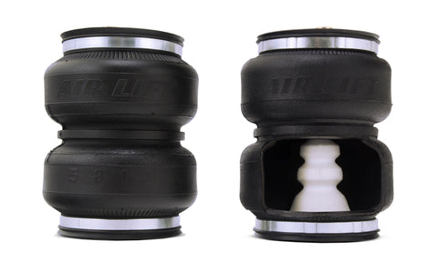 LoadLifter 5000 ULTIMATE adjustable air spring kits feature all of the benefits of our heaviest rated air spring with the addition of an internal jounce bumper inside the spring for the ultimate in ride comfort. An Air Lift exclusive product! Fits vehicles with in-bed hitches. Tow and haul the heaviest loads with safety and comfort with LoadLifter 5000 ULTIMATE. Works with vehicle's leaf springs to provide up to 5,000 lbs. of rear load leveling capacity and keeps the vehicle riding stable, level and comfortable whether loaded or unloaded. Fully adjustable from 5 to 100 PSI. The closed-cell urethane foam jounce bumper inside the ULTIMATE air springs provide a cushion of air that absorbs shock, eliminates harsh jarring on rough roads and protects vehicles carrying heavy loads. Never bottom out again with the ULTIMATE! LoadLifter 5000 ULTIMATE air springs are maintenance free! Safely run with zero air pressure because of the internal jounce bumper. Replaces factory jounce bumper that is sometimes removed when adding air springs. Requires no drilling into frame! Includes industry-exclusive 60 Day No Questions Money Back Guarantee! Includes the most comprehensive Lifetime Warranty in the industry---covers all kit contents including brackets, fittings and air line. Air springs are built like a tire and are reinforced by durable, 2-ply fabric for maximum strength. Exclusive upper and lower roll plates included. Protect the springs from sharp edges, such as brackets or the frame. The kit includes 2 air springs, brackets, air lines, Schrader valve and all of the hardware needed for installation. Includes fully illustrated instruction manual. Add an Air Lift on-board air compressor system to inflate and deflate air springs with the touch of a button from inside or outside of the vehicle.