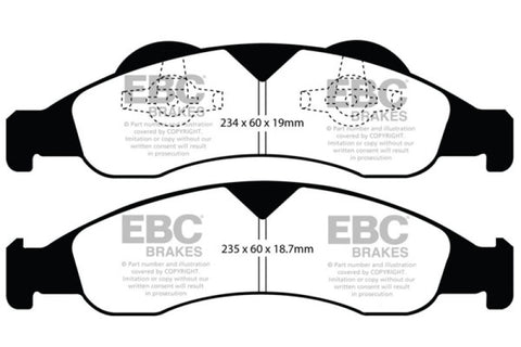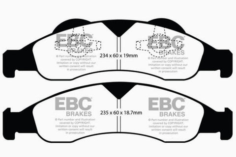EBC Yellowstuff is an aramid fibre based brake compound with high brake effect form cold and is possibly one of the first ever compounds that can be used for STREET AND TRACK DRIVING. These pads do not require warm up but do get even stronger under the heat of hard driving. These are not a low dust pad and if your desire is for a low dust premium street use pad, you should consider EBC Redstuff.When considering full race use, Yellowstuff has been a strong favourite, having been used for two years in the Swedish Camaro Cup and at numerous other race events where a stock caliper system is fitted.It is also the choice of 90-percent of the Mazda MX5 Miata competitors in the UK race series and has an unblemished record as rotor friendly track pad for vehicles up to 2000 lbs weight or 200 BHP.In the USA the SCCA and NASA drivershave been testing Yellowstuff with feedback and good reports POURING in from a 543 test driver major market proving event with these groups. Read that figure again 543 test drivers.There is no guesswork here.