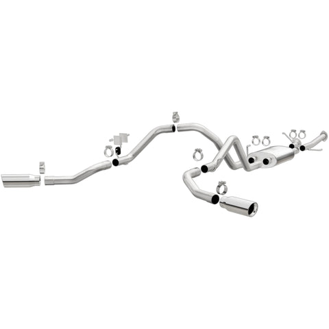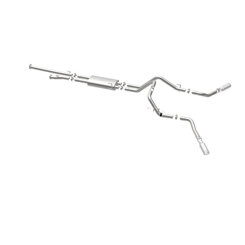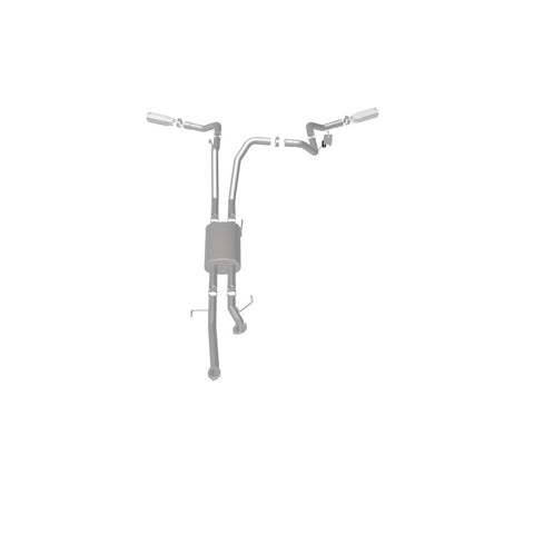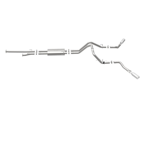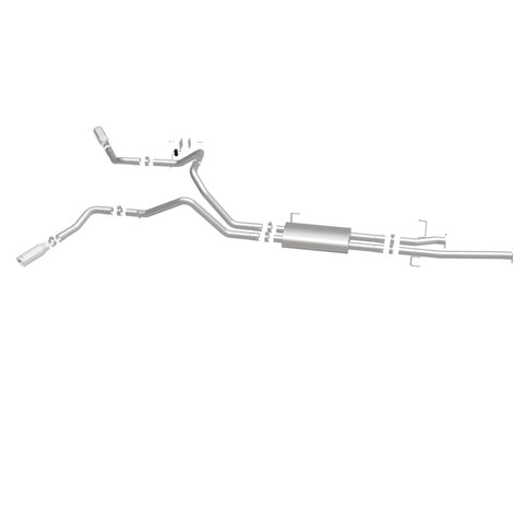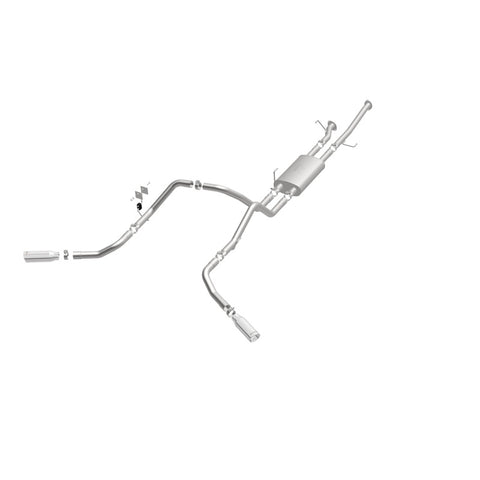 The MagnaFlow 2009-2021 Toyota Tundra Street Series Cat-Back Performance Exhaust System 19232 brings out the personality of your 4.6L, 4.7L, 5.7L 2009-2021 Toyota Tundra with our signature resonant, powerful engine tone and dyno-proven performance. Thanks to its fast-flowing, mandrel bent 2.5in. main piping and 1 Straight-Through mufflers ending in a Dual Split Rear Behind Rear Tires exit with 4in. Polished Clamp-On Double Wall Angle Cut Rolled Edge tips, this Toyota Tundra exhaust kit has the performance chops to match its sporty sound and appearance. Upgrade your ride to the next level with an exhaust that has the pipes to put other Toyota Tundra's to shame. With this system your vehicle will be producing Aggressive exterior and Moderate interior sound levels while leaving other cars and trucks feeling envious at every stoplight. Exhaust kit 19232 features a cat-back layout that replaces your ride's stock exhaust components from near the catalytic converter on back. Extensive 3D scanning during development has resulted in a direct-fit design that you can easily install yourself. 19232 is produced using CNC precision robotic manufacturing techniques and is backed by MagnaFlow's 1-year limited finish warranty and limited lifetime construction warranty.