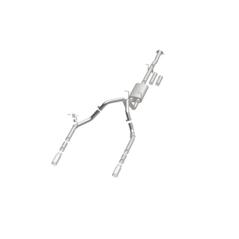 The MagnaFlow Street Series Cat-Back Performance Exhaust System 19027 brings out the personality of your Truck with our signature resonant, powerful engine tone and dyno-proven performance. Thanks to its fast-flowing, mandrel bent 3.5in. main piping and 1 Straight-Through mufflers ending in a Dual Split Rear exit with 4in. Polished Clamp-On Double Wall Angle Cut Rolled Edge tips, this Truck exhaust kit has the performance chops to match its sporty sound and appearance. Upgrade your ride to the next level with an exhaust that has the pipes to put other Truck's to shame. With this system your vehicle will be producing Aggressive exterior and Moderate interior sound levels while leaving other cars and trucks feeling envious at every stoplight. Exhaust kit 19027 features a cat-back layout that replaces your ride's stock exhaust components from near the catalytic converter on back. Extensive 3D scanning during development has resulted in a direct-fit design that you can easily install yourself. 19027 is produced using CNC precision robotic manufacturing techniques and is backed by MagnaFlow's 1-year limited finish warranty and limited lifetime construction warranty.