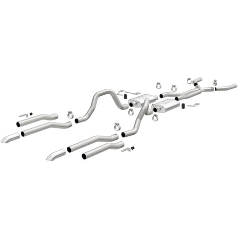 The MagnaFlow Street Series Crossmember-Back Performance Exhaust System 19303 19303 brings enhanced engine sound and dyno-proven performance to your muscle car with a healthy helping of our deep, resonant signature exhaust note at Moderate exterior and Mild interior sound levels. Thanks to its durable, corrosion resistant stainless steel design, this exhaust system will handle whatever tarmac you decide to leave your mark on. This performance exhaust kit features a crossmember-back layout designed to replace your exhaust system from the crossmember on back. With its fast-flowing, mandrel bent 2.5in. main piping and 2 Straight-Through mufflers ending in a Dual Split Rear exit with 2.625in. Polished Weld-On Single Wall Turndown Cut Edge tips, your muscle car will be sounding as awesome as it looks. Extensive 3D scanning during development has resulted in a direct-fit design that you can easily install yourself. 19303 is produced using CNC precision robotic manufacturing techniques and is backed by MagnaFlow's limited lifetime construction warranty.